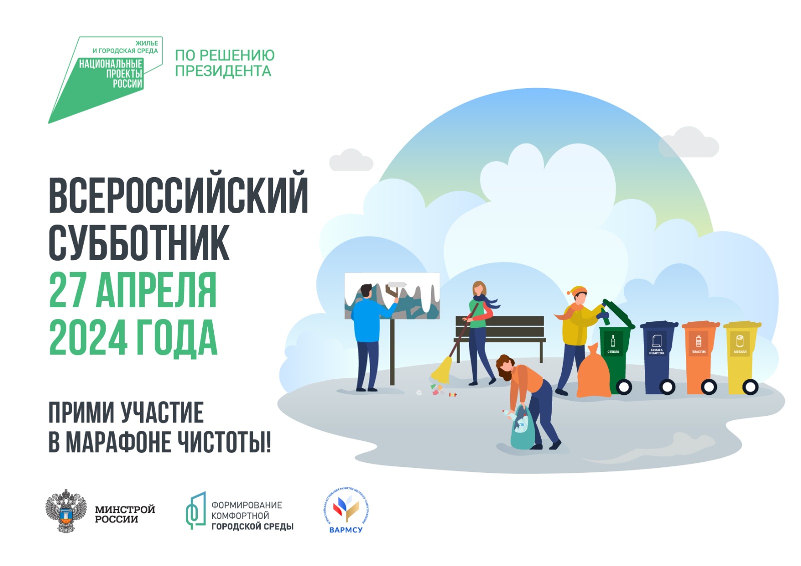 26.04.2024Чеченская Республика присоединится ко Всероссийскому субботнику.27 апреля во всех районах Чеченской Республики пройдут массовыемероприятия по уборке парков, скверов и других зон отдыха,благоустроенных в рамках нацпроекта «Жильё и городская среда».В последнюю субботу апреля в Чеченской Республике, как и всехрегионах России, при поддержке Минстроя России пройдет субботник.Всероссийский марафон чистоты объединит всех желающих внести лепту всоздание комфорта в своем населенном пункте. В числе ключевыхмероприятий – уборка и озеленение территорий, покраска уличной мебели идр.Кроме этого, участники субботника смогут пообщаться с волонтерамиВсероссийского онлайн-голосования за объекты городской среды ипроголосовать за обновление одного из пространств, представленных насайте za.gorodsreda.ru. Отметим, онлайн-голосование проходит с 15 марта по30 апреля и позволяет всем жителям старше 14 лет напрямую влиять наповышение качества городской среды через единую платформу.